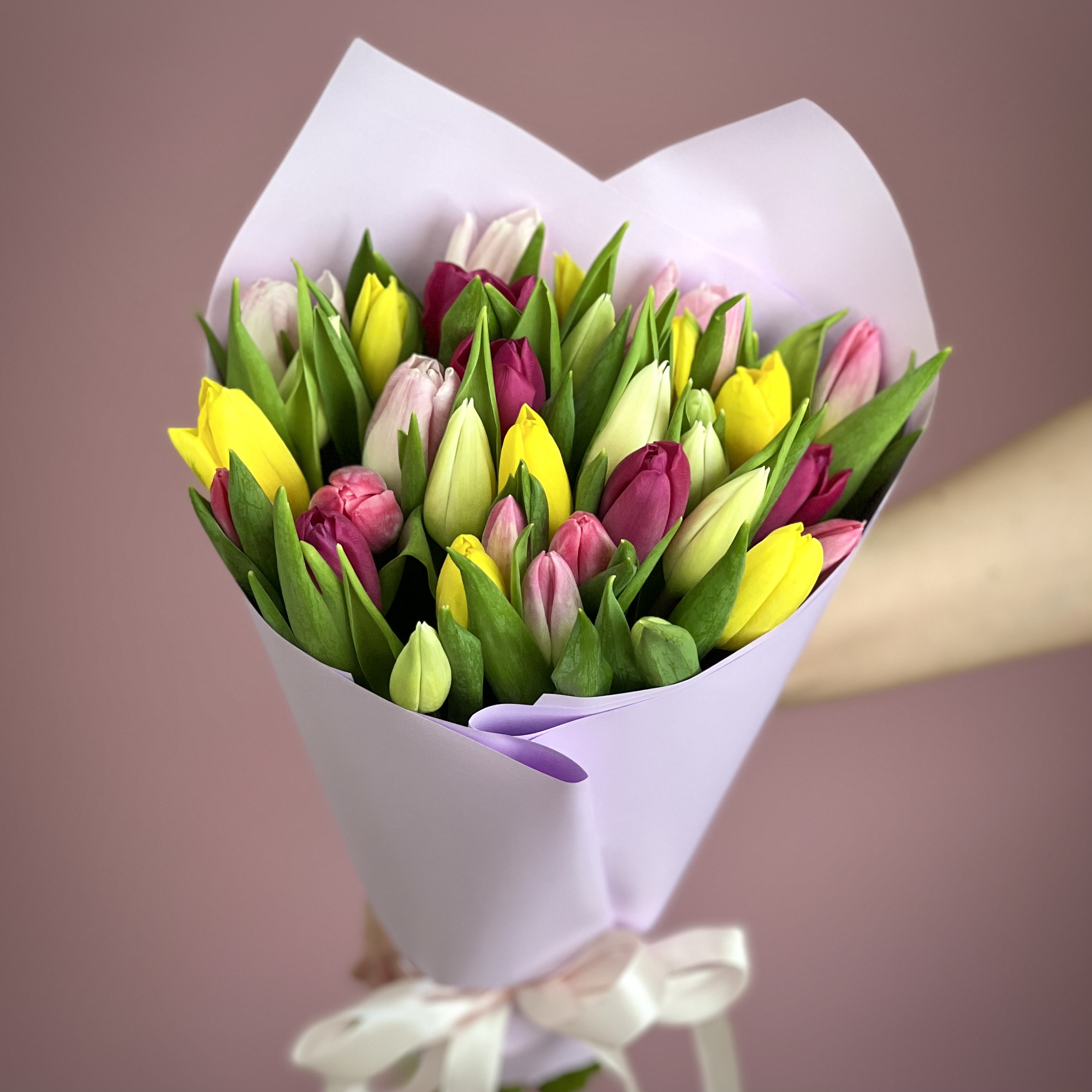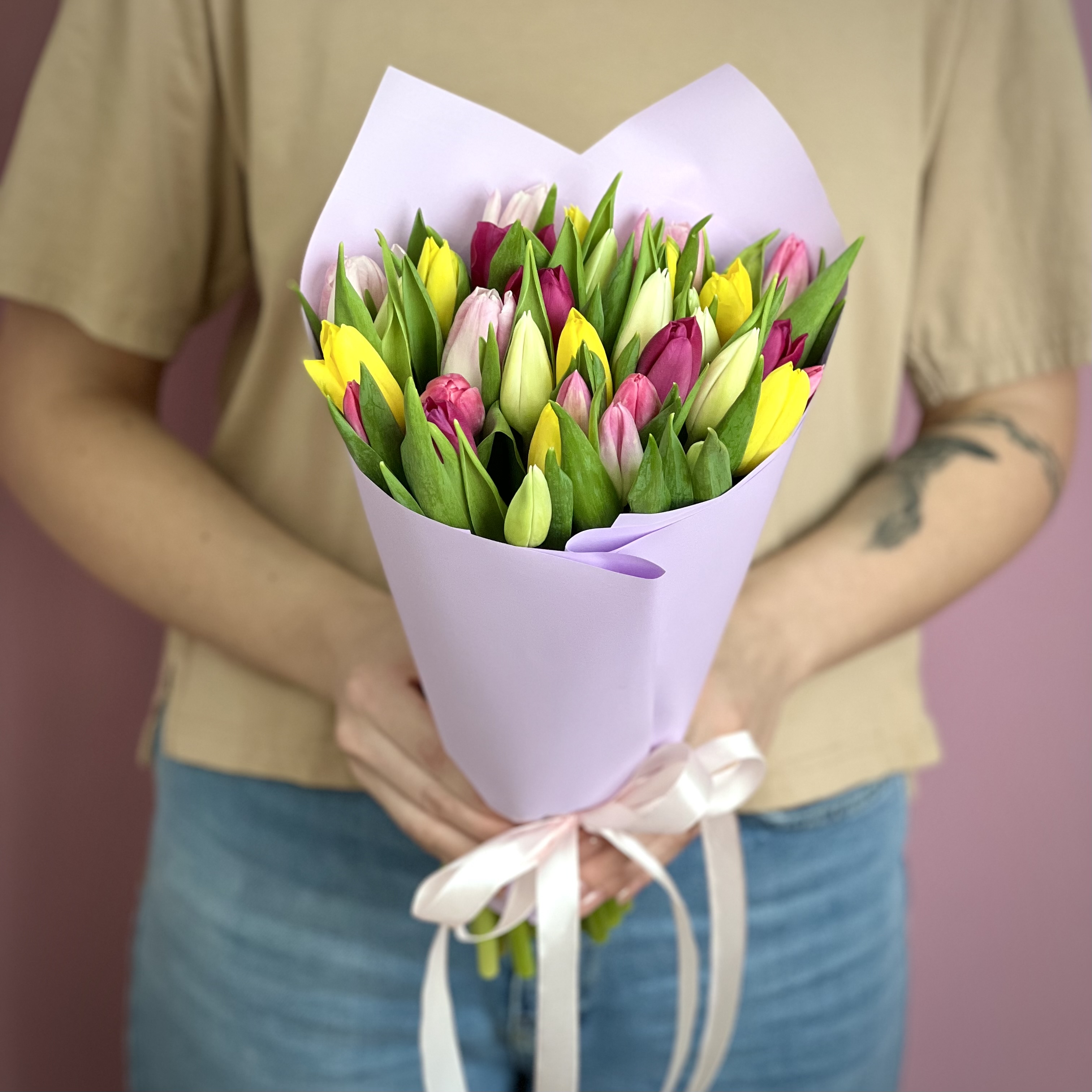 Нежный весенний букет из 35 тюльпанов. Оттенок цветов можно выбирать на сайте, как и вариант упаковки. Предлагаем оригинальное оформление цветочных композиций опытными флористами. Нежные и не до конца распустившиеся тюльпаны истончают приятный аромат, ассоциируются с наступлением весны и совершенством мира природы.